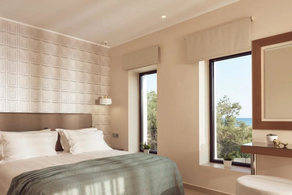 Das Resort kombiniert entspanntes, boho-inspiriertes Design mit luxuriösen Annehmlichkeiten. Verwöhn dich im Spa, schwimm in einem der Privatpools oder genieß die wohlige Atmosphäre der Anlage. Die Restaurants und Bars bieten schmackhafte griechische und internationale Küche, während das gesamte Ambiente Leichtigkeit und Charme ausstrahlt. Perfekter Rückzugsort für Körper und Seele.