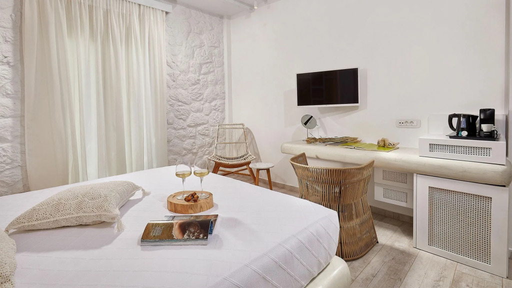 Die Zimmer der Petri Suites sind funktional und charmant. Jeder Raum erzählt eine kleine Erzählung von Santorins reicher Geschichte und natürlicher Schönheit. Hier erwartet dich eine ruhige Oase, ideal für die sanfte Erholung nach einem Tag voller Entdeckungen. Warme, erdige Töne treffen auf das Blau und Weiß des Mittelmeers, die Ausstattung ist einfach, aber liebevoll ausgewählt.
