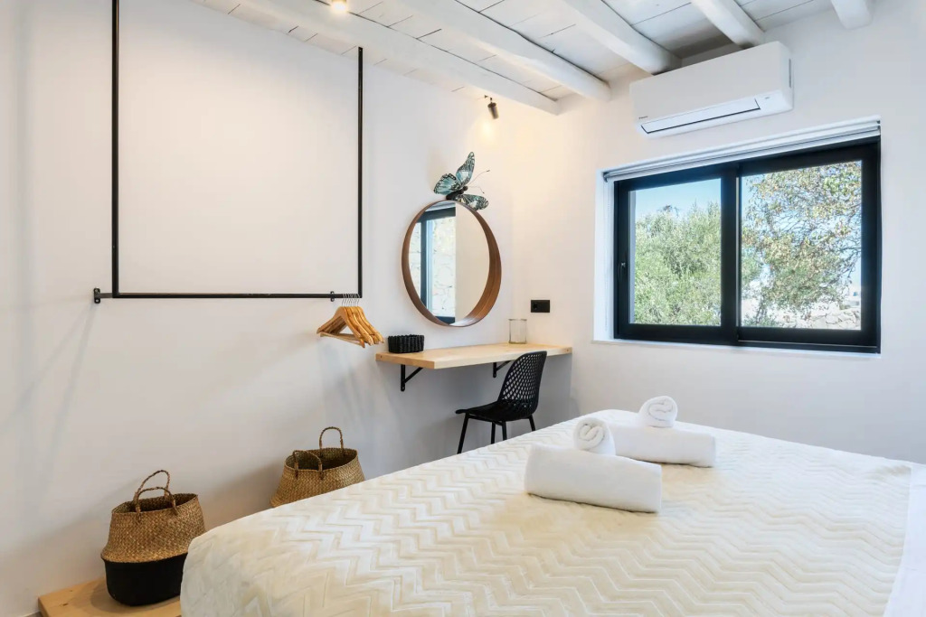 Die Villa besticht durch großzügige Zimmer mit einem einladenden und warmen Design. Sanfte Erdtöne, luxuriöse Stoffe und viel Licht schaffen einen Ort der Entspannung. Hier aufzuwachen bedeutet, bereit zu sein, das Beste aus jedem Tag auf Mykonos zu machen. Jedes Schlafzimmer bietet Raum für Privatsphäre und Harmonie – perfekt, um sich zwischen Abenteuern auf der Insel zurückzuziehen.